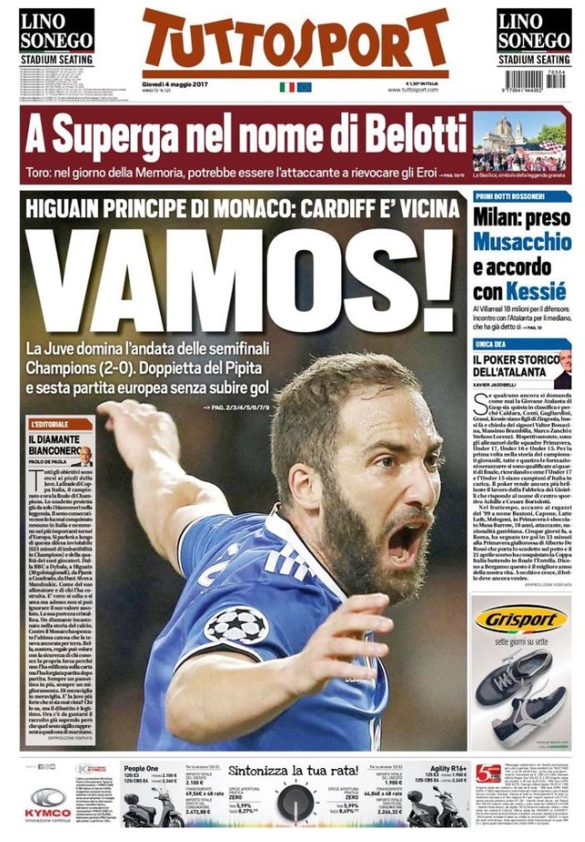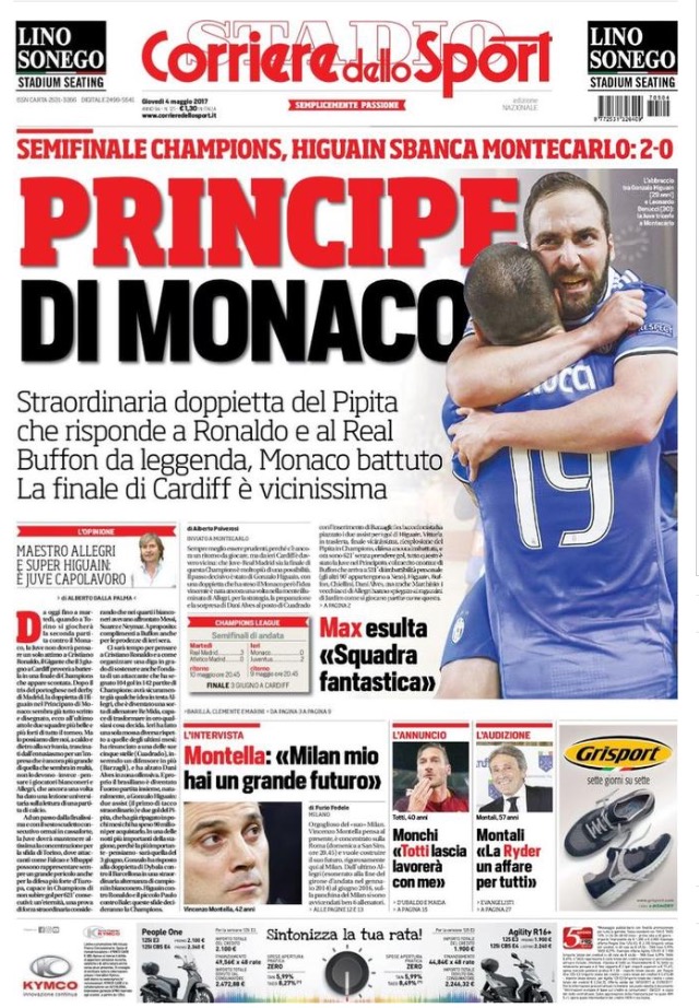 [caption id="attachment_18391" align="alignnone" width="640"] TuttoSport 4 Maggio 2017[/caption] [caption id="attachment_18392" align="alignnone" width="640"] Corriere Dello Sport 4 Maggio 2017[/caption]