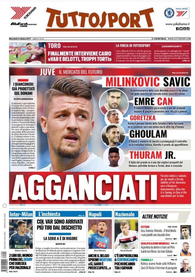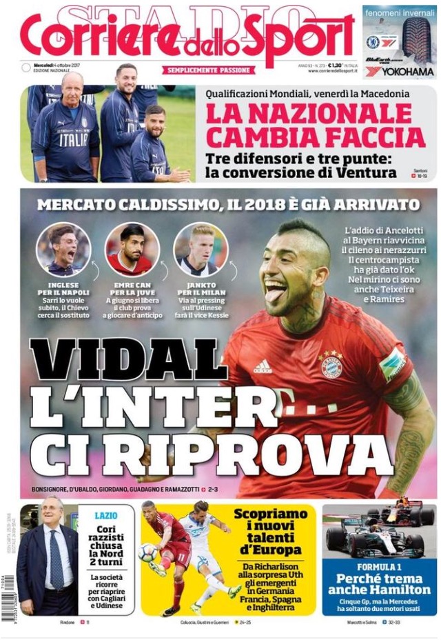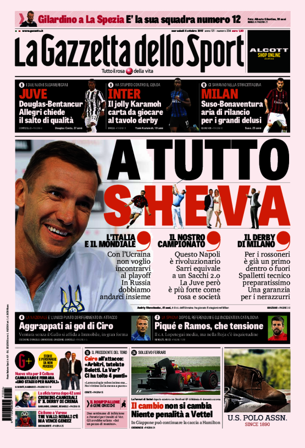 [caption id="attachment_30446" align="alignnone" width="614"] La Gazzetta Dello Sport 4 Ottobre 2017[/caption] [caption id="attachment_30447" align="alignnone" width="640"] TuttoSport 4 Ottobre 2017[/caption] [caption id="attachment_30448" align="alignnone" width="640"] Corriere Dello Sport 4 Ottobre 2017[/caption] [caption id="attachment_25119" align="alignnone" width="300"] Sponsor Autoè[/caption]