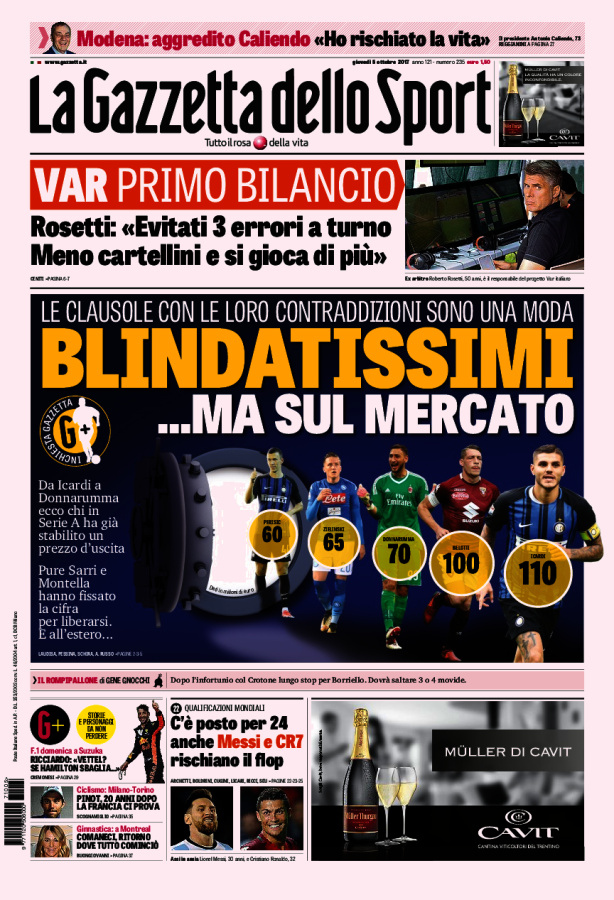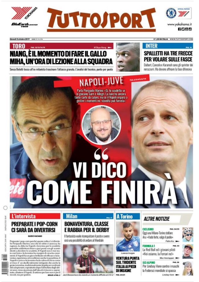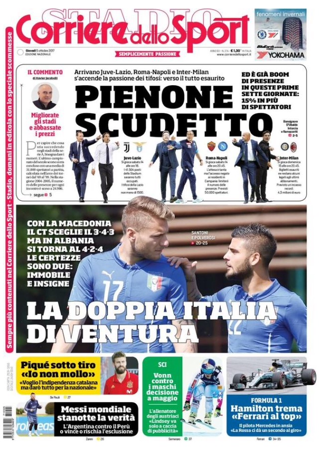 [caption id="attachment_30524" align="alignnone" width="614"] La Gazzetta Dello Sport 5 Ottobre 2017[/caption] [caption id="attachment_30525" align="alignnone" width="640"] Corriere Dello Sport 5 Ottobre 2017[/caption] [caption id="attachment_30526" align="alignnone" width="640"] TuttoSport 5 Ottobre 2017[/caption] [caption id="attachment_25119" align="alignnone" width="300"] Sponsor Autoè[/caption]