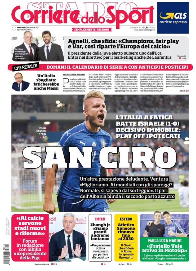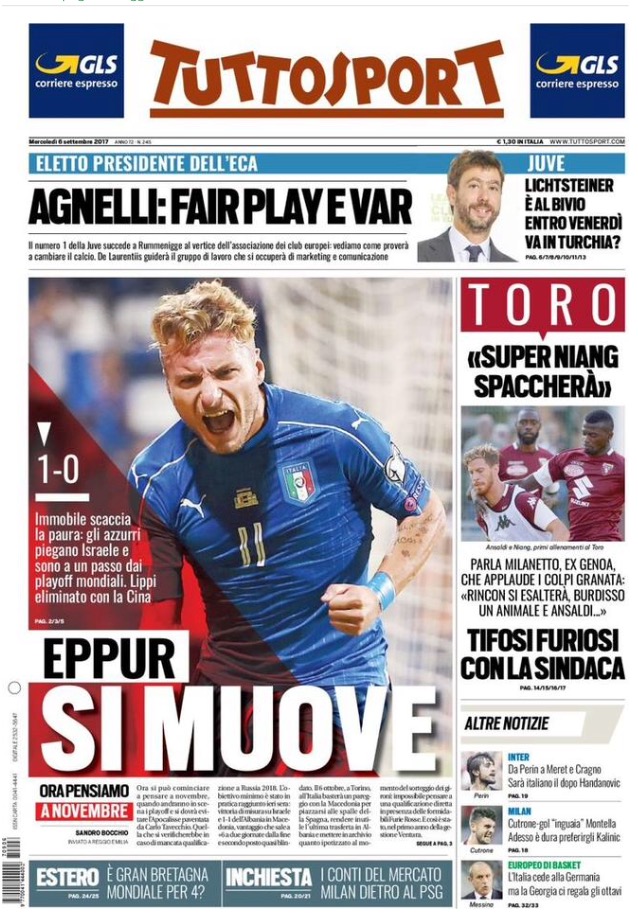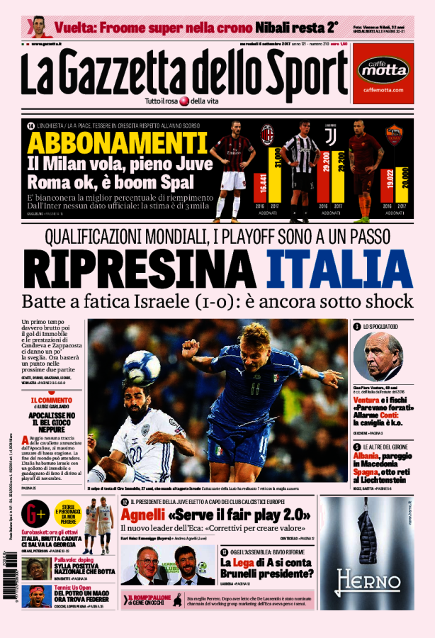 [caption id="attachment_28260" align="alignnone" width="638"] TuttoSport 6 Settembre 2017[/caption] [caption id="attachment_28261" align="alignnone" width="640"] Corriere Dello Sport 6 Settembre 2017[/caption] [caption id="attachment_28262" align="alignnone" width="614"] La Gazzetta Dello Sport 6 Settembre 2017[/caption] [caption id="attachment_25119" align="alignnone" width="300"] Sponsor Autoè[/caption]