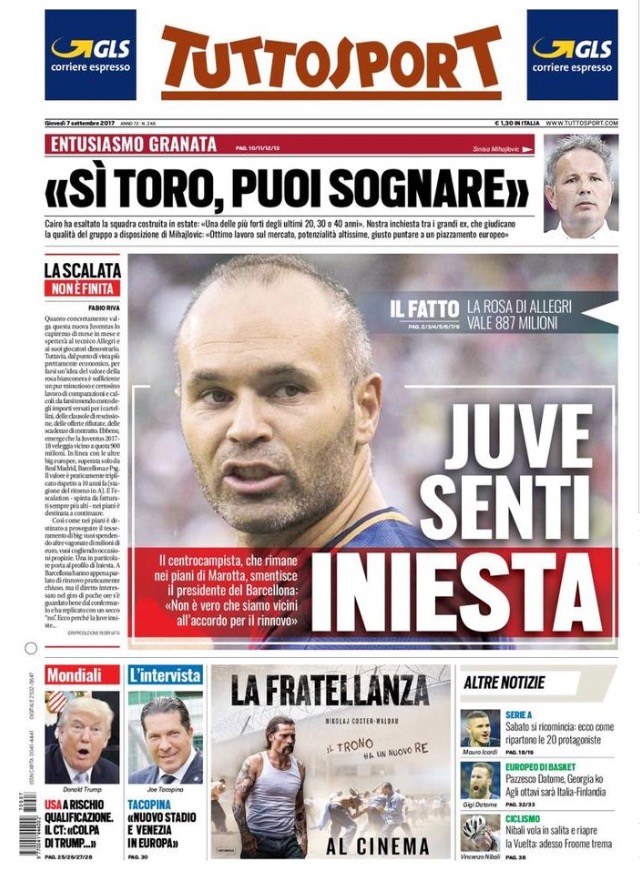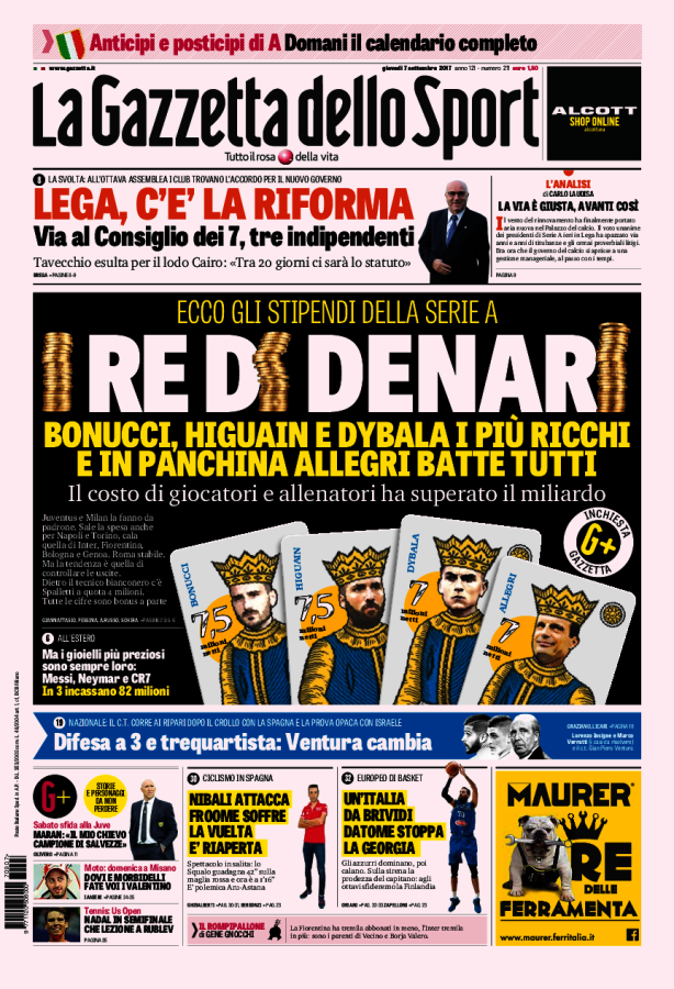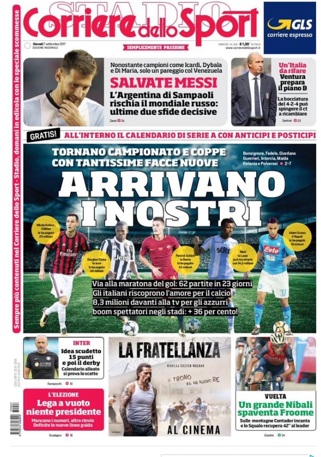 [caption id="attachment_28330" align="alignnone" width="614"] La Gazzetta Dello Sport 7 Settembre 2017[/caption] [caption id="attachment_28331" align="alignnone" width="640"] Corriere Dello Sport 7 Settembre 2017[/caption] [caption id="attachment_28332" align="alignnone" width="640"] TuttoSport 7 Settembre 2017[/caption] [caption id="attachment_25119" align="alignnone" width="300"] Sponsor Autoè[/caption]