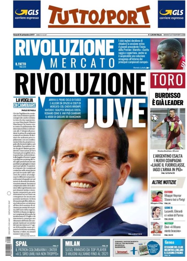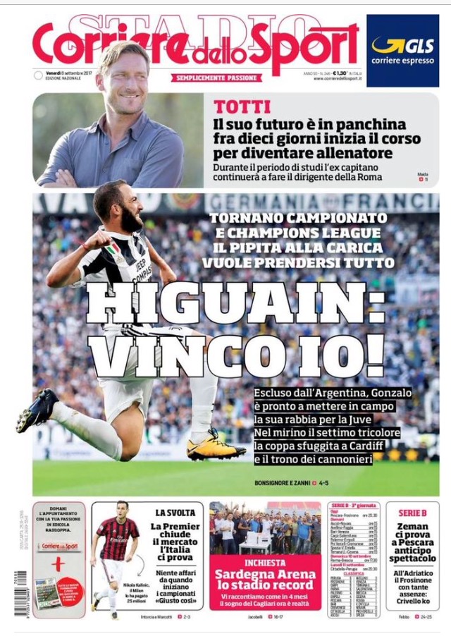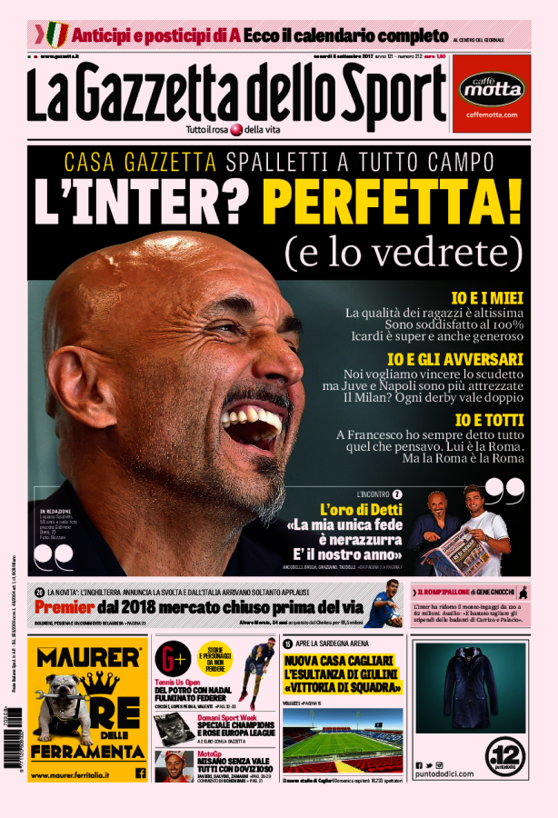[caption id="attachment_28384" align="alignnone" width="614"] La Gazzetta Dello Sport 8 Settembre 2017[/caption] [caption id="attachment_28385" align="alignnone" width="623"] TuttoSport 8 Settembre 2017[/caption] [caption id="attachment_28386" align="alignnone" width="640"] Corriere Dello Sport 8 Settembre 2017[/caption] [caption id="attachment_25119" align="alignnone" width="300"] Sponsor Autoè[/caption]