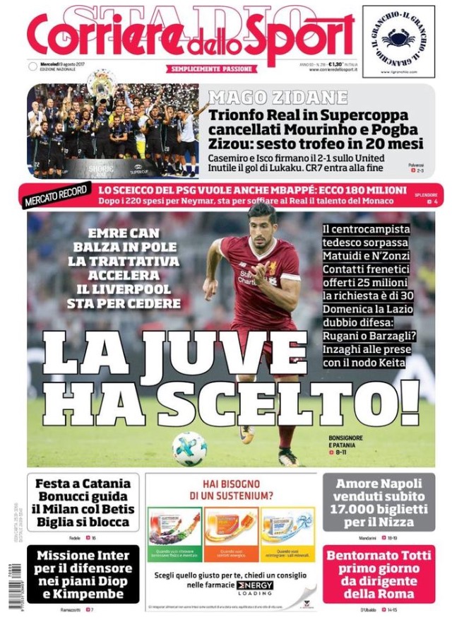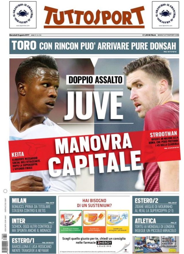 Le prime pagine dei principali quotidiani sportivi – 9 Agosto 2017