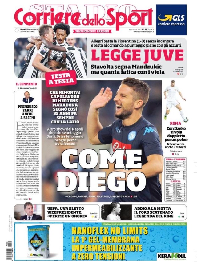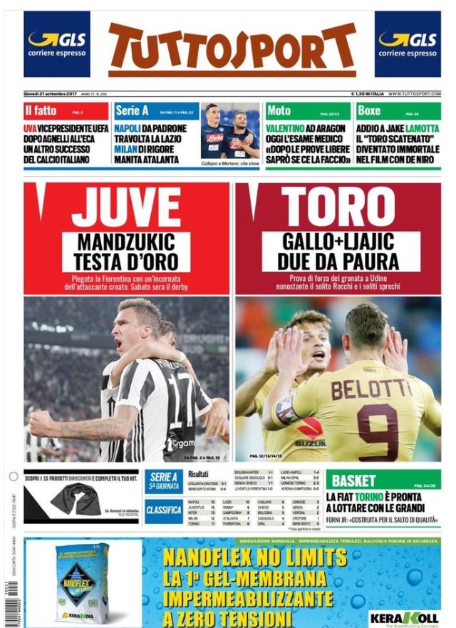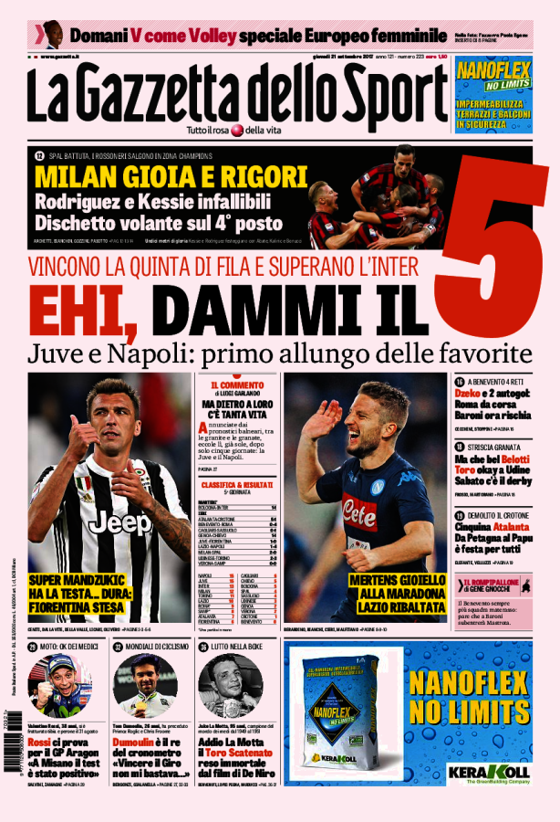 Le prime pagine dei principali quotidiani sportivi nazionali – 21 Settembre 2017
