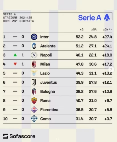 Sofascore fa una classifica usando gli expected gol del campionato di Serie A a 10 giornate dalla fine. La Fiorentina in questa classifica sarebbe al nono posto confermando un rendimento molto altalenante e non da Europa. Molto bene invece tra le piccole il Como, che si piazzerebbe subito alle spalle della squadra viola, e delle big ottimo il rendimento dell’Atalanta che è seconda ad un passo dall’Inter