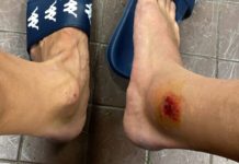 Lirola mostra come è ridotta la sua caviglia dopo la partita vinta contro l’Udinese