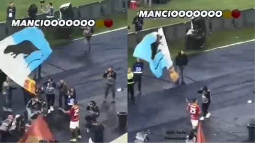 Gianluca Mancini ha deciso il derby della capitale con un gol di testa. Alla fine della partita il difensore della Roma ha festeggiato sotto la Curva Sud prendendo una bandiera biancoceleste con un ratto nero al centro e sventolandola per qualche secondo, prima di riconsegnarla ai tifosi.
