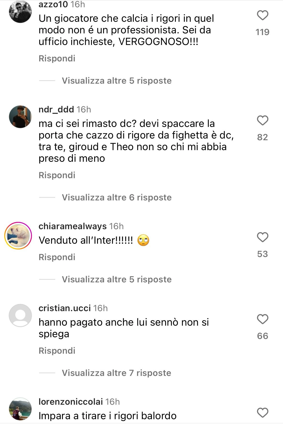 Se questi episodi hanno fatto discutere opinionisti, giornalisti e tifosi di ogni squadra, sono soprattutto questi ultimi che nelle ultime ore stanno riempiendo il profilo Instagram di Nico di offese e accuse, legate al brutto rigore calciato al 77esimo minuto dall’esterno argentino. Se alcuni commenti possono essere considerati “leggeri” e probabilmente legati a questioni fantacalcistiche, altri sono decisamente più pesanti: si passa da insulti più o meno gravi a numerose accuse di match fixing e calcioscommesse, secondo cui Nico Gonzalez avrebbe venduto la partita all’Inter per sfavorire la Juventus. Tra questi, si trovano persino commenti in inglese, che dimostrano come il “Nico gate“ non sia passato inosservato nemmeno all’estero.