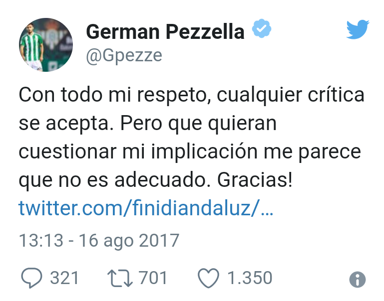 Questo il post del difensore German Pezzella su Twitter “Con tutto il rispetto, ogni critica è accettata, ma non si dica che non mi impegno”. Questo è stato un tweet del difensore argentino che risponde ad un articolo dei media spagnolo che lo accusano di scarso impegno con il nuovo allenatore del Betis. Un nuovo grande indizio verso un suo addio destinazione Fiorentina.