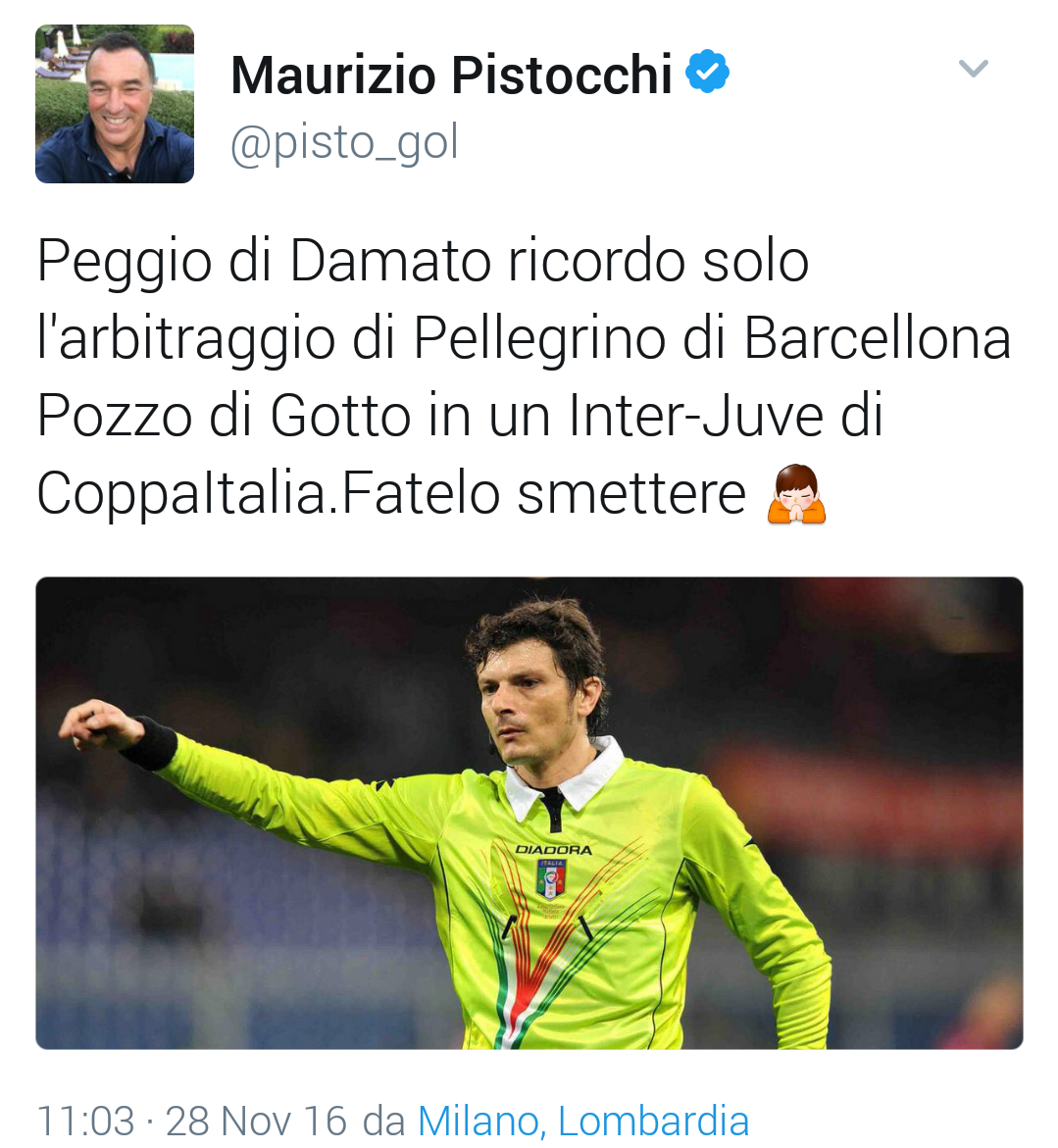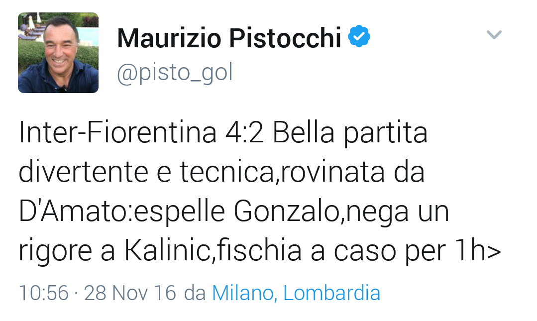 Il giornalista di Mediaset Maurizio Pistocchi ha parlato e commentato la partita tra Inter e Fiorentina e nello specifico la prestazione dell’arbitro Damato sul suo profilo Twitter, il giornalista ha scritto: “Peggio di Damato solo l’arbitraggio di Inter – Juventus in Coppa Italia. Fatelo smettere per favore” e poi ha aggiunto “Inter – Fiorentina 4-2 bella partita, rovente e tecnica, rovinata da Damato: espelle Gonzalo, nega un rigore, fischia a caso per un ora” ha così commentato Maurizio Pistocchi.