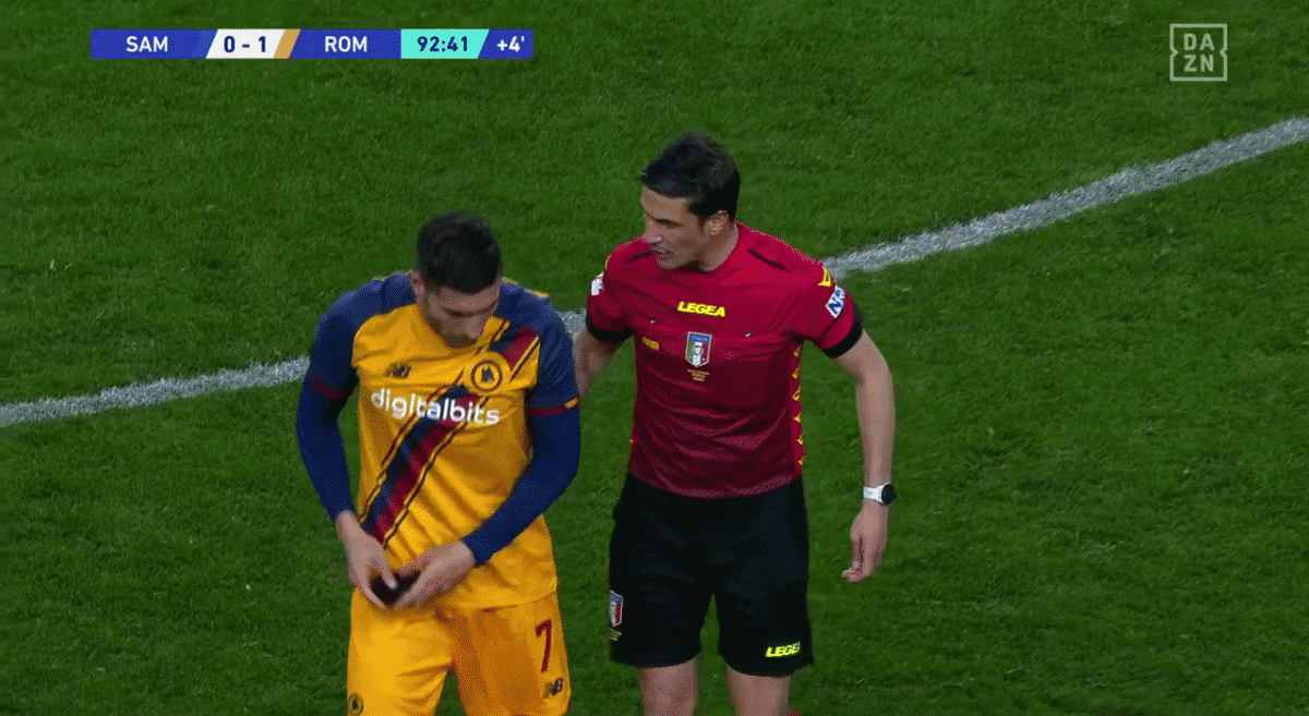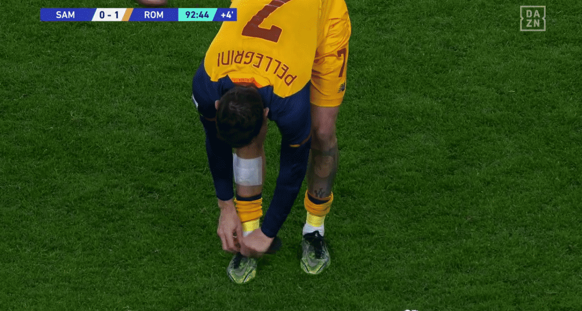 Minuto 93 di Sampdoria-Roma, Josè Mourinho a partita praticamente conclusa chiama il cambio e tira fuori il capitano della Roma Lorenzo Pellegrini. Il giocatore giallorosso fa di tutto per essere ammonito perchè, essendo diffidato, con un giallo avrebbe saltato la prossima gara contro la Salernitana, ormai praticamente con un piede e mezzo in serie B. Pellegrini prima si toglie i parastinchi, ma l’arbitro non lo ammonisce e lo invita solo ad accelerare l’uscita dal campo, cosi che Pellegrini ci riprova, questa volta si ferma in mezzo al campo per allacciarsi le scarpe. A questo punto il giallo è stato inevitabile. Missione compiuta. Una farsa insomma.