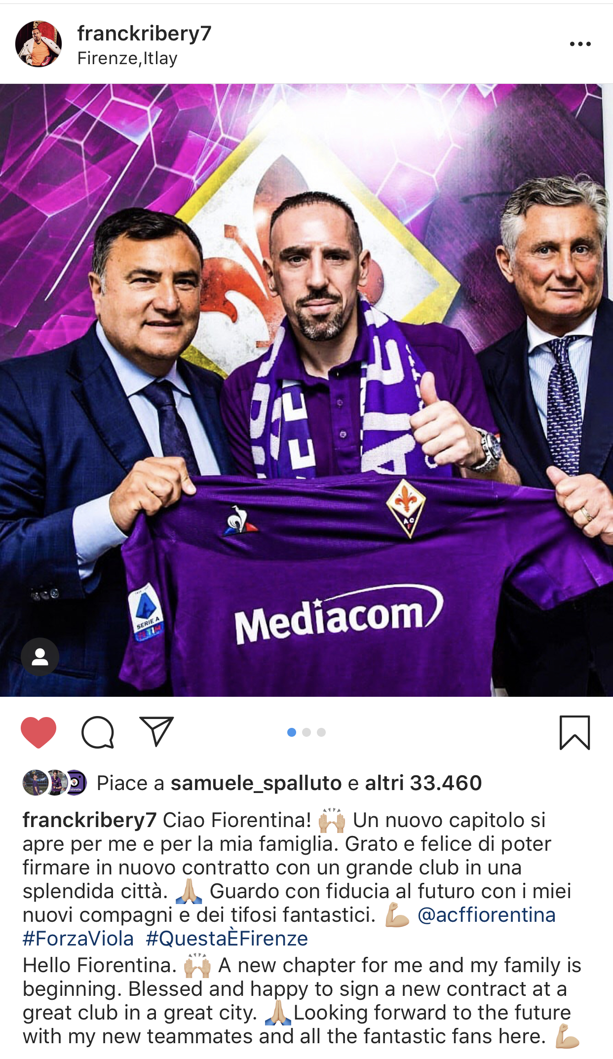 Queste sono le parole che ha voluto affidare ad Instagram Franck Ribery dopo essere arrivato a Firenze: “Ciao Fiorentina! Un nuovo capitolo si apre per me e per la mia famiglia. Grato e felice di poter firmare un nuovo contratto con un grande club in una splendida città. Guardo con fiducia al futuro con i miei nuovi compagni e dei tifosi fantastici”.