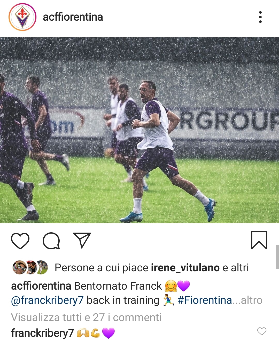 “Ribery ha un infortunio al ginocchio e non si sta allenando da giorni”. L’annuncio da parte di Vincenzo Montella sabato in conferenza stampa, la settimana scorsa il fenomeno francese ha approfittato dalla squalifica per curare il ginocchio infortunato, oggi il suo rientro definitivo in gruppo, come dimostra il post della Fiorentina su Instagram