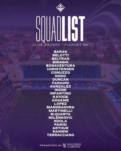 Sono stati diramati i convocati della Fiorentina per la trasferta di ritorno a Brugge per la semifinale di Conference League che può valere una stagione: tutti presenti, ci sono anche Bonaventura e Nzola che avevano svolto anche stamattina lavoro personalizzato, assenti solo Sottil a causa dell’infortunio e Castrovilli che non fa parte della lista europea.