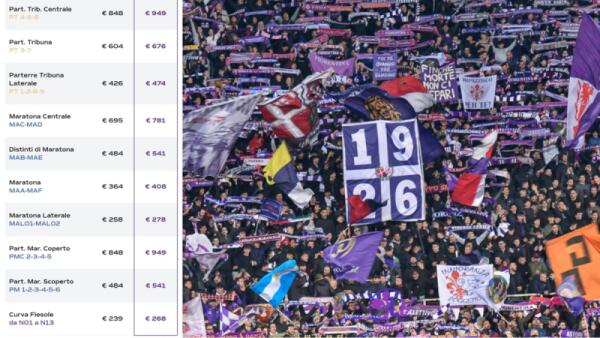 I prezzi degli abbonamenti della Fiorentina: Curva Fiesole 268 euro, Tribuna 949 euro, Maratona 541 euro