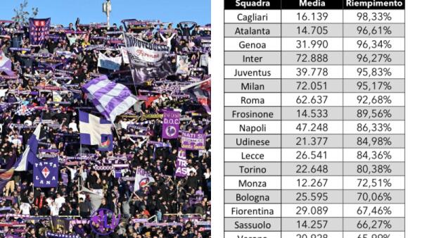 La Fiorentina è 8° per media spettatori in Serie A con meno di 30 mila tifosi. Dato in calo rispetto alla scorsa stagione