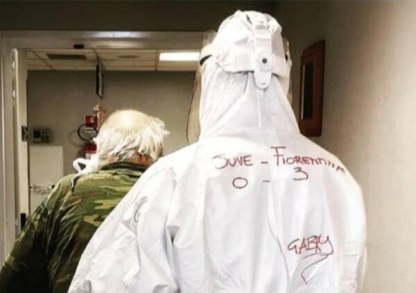 Nell'ospedale Versilia si combatte il Covid con la tuta segnata "Juventus-Fiorentina 0-3". Un tifoso viola mostra la sua tuta speciale