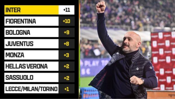 Solo l'Inter ha fatto meglio della Fiorentina, più 10 punti in campionato rispetto all'anno scorso