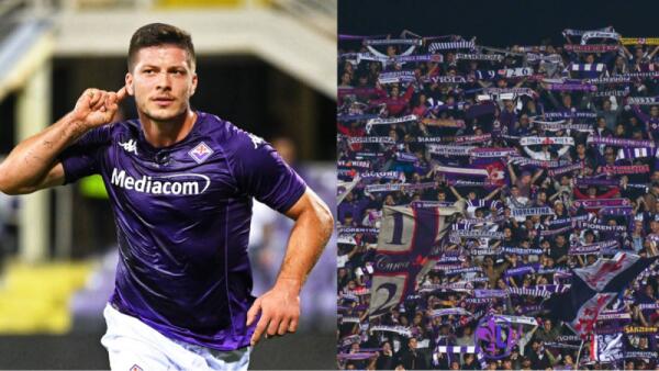 Jovic va sotto i tifosi della Fiorentina, braccia alzate e saluti, tifosi viola rispondono con applausi