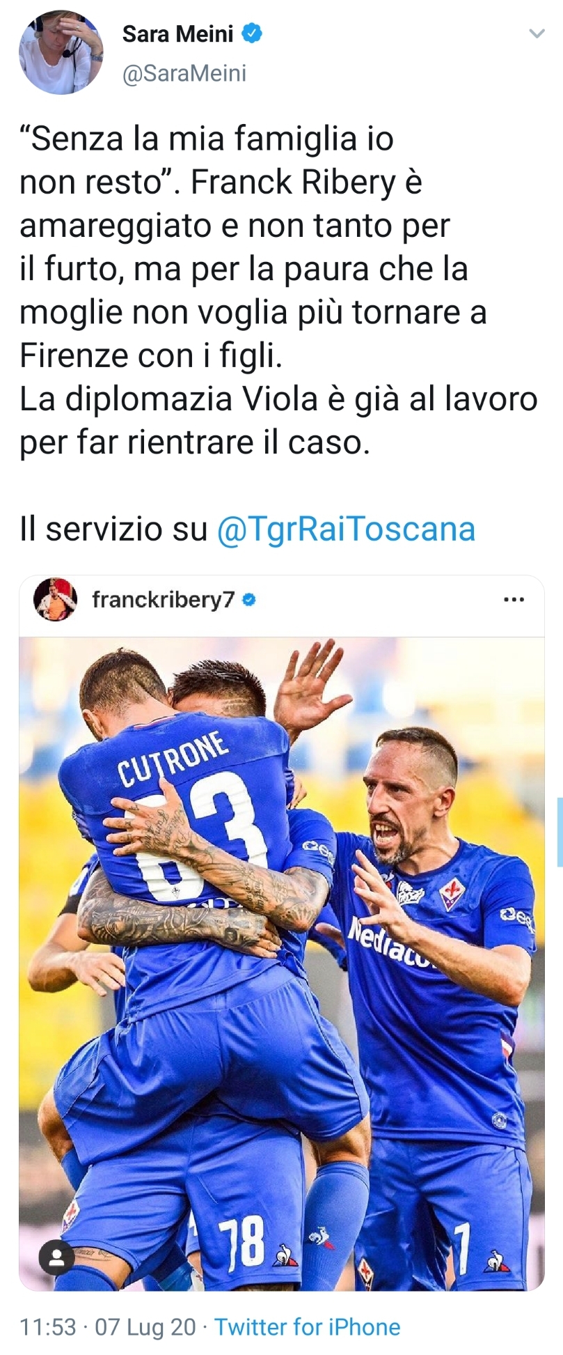 La giornalista Rai Sara Meini, annuncia su Twitter alcune dichiarazioni del campione della Fiorentina Franck Ribery dopo il furto subito nella sua abitazione. Da ciò che scrive la giornalista la Fiorentina sarebbe al lavoro per tranquillizzare la famiglia del francese, al fine di evitare l’addio a Firenze. Ecco io tweet presente sulla pagina del TgR Toscana