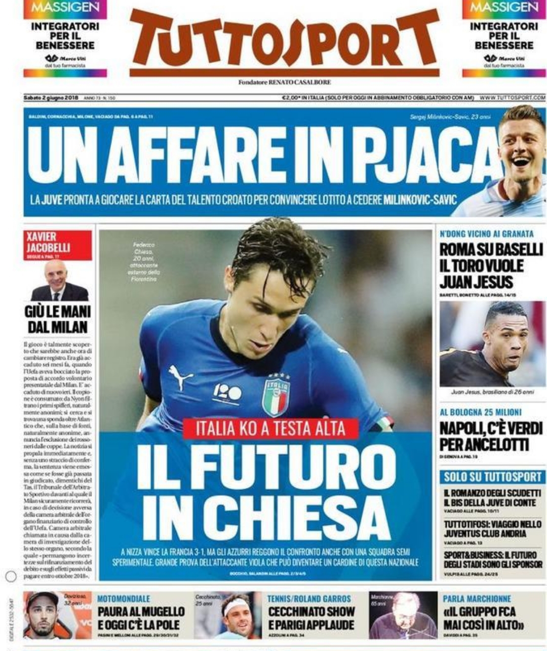 Tuttosport dedica la prima pagina a Federico Chiesa ieri migliore in campo, sarà sicuramente un punto fermo di questa Nazionale. L’esterno viola ha grinta, infilza le difese avversarie e porta avanti la squadra da vero leader. Viene elegiato così il talento classe 97 della Fiorentina, ecco la prima pagina del quotidiano.