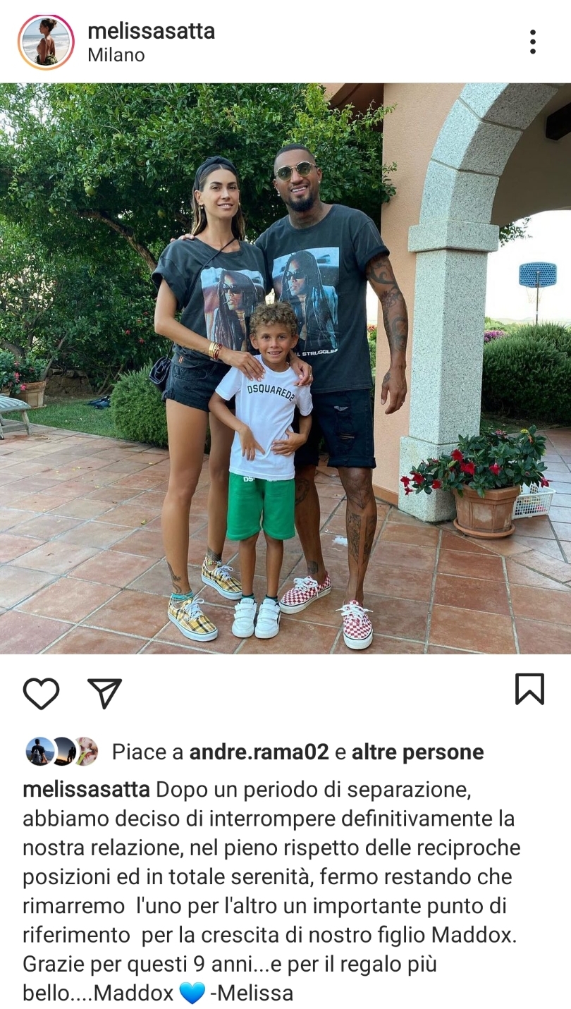 “Dopo un periodo di separazione, abbiamo deciso di interrompere definitivamente la nostra relazione nel pieno rispetto delle reciproche posizioni ed in totale serenità, fermo restando che rimarremo l’uno per l’altro un importante punto di riferimento per la crescita di nostro figlio Maddox. Grazie per questi 9 anni… e per il regalo più bello… Maddox”. Così la showgirl ed ex velina Melissa Satta ha ufficializzato sul suo profilo Instagram la rottura con il marito, il calciatore Kevin Prince Boateng attualmente al Monza, fino a pochi mesi fa un giocatore della Fiorentina.
